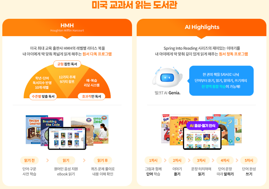 밀크T는 압도적인 교과서 점유율을 자랑하는 천재교육의 노하우가 담겨 있어, 실제 학교 교과 과정과 완벽히 호환됩니다. 초등학교영어 학습 시작 전 어휘, 듣기, 말하기, 문법, 독해 등 각 영역별로 아이의 취약점과 강점을 분석해 주는 세밀한 진단 도구를 제공하는 것이 특징입니다. 이 객관적인 리포트를 바탕으로 1:1 맞춤 시간표를 설계하여 파닉스부터 원서 읽기까지 초등학교영어의 전 영역을 고르게 발달시킬 수 있습니다. 특히 미국 현지 학생들이 읽는 교과서 원서를 레벨별로 제공하는 프로그램과 영문 기사로 시사 상식과 심화 독해력을 함께 기를 수 있어 원어민 감각을 자연스럽게 익히는 데 유리합니다.